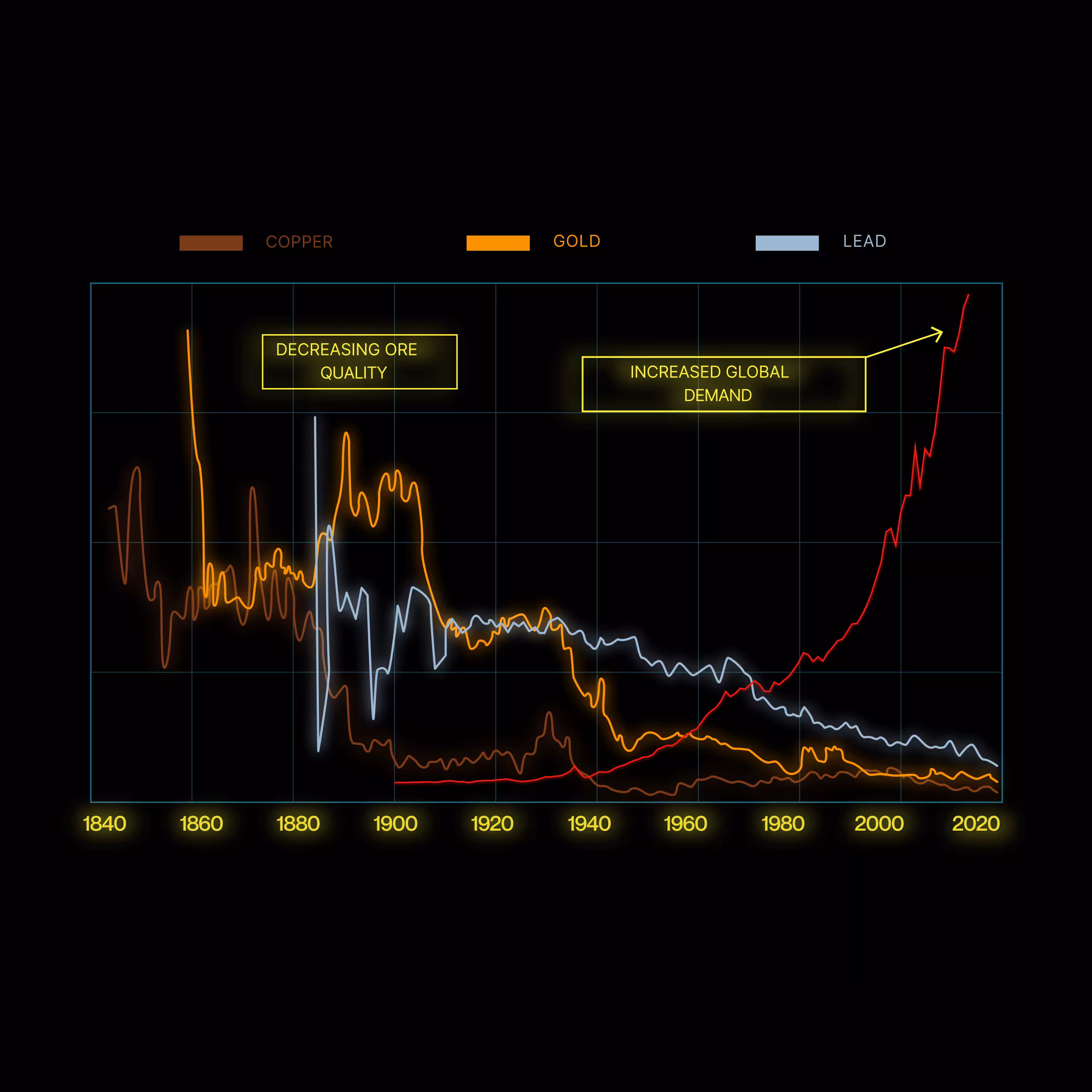 Ore quality at global mining hubs such as australia is decreasing, which means far more energy and capital are needed to recover the same amount of metal. All while demand for critical metals is increasing rapidly.